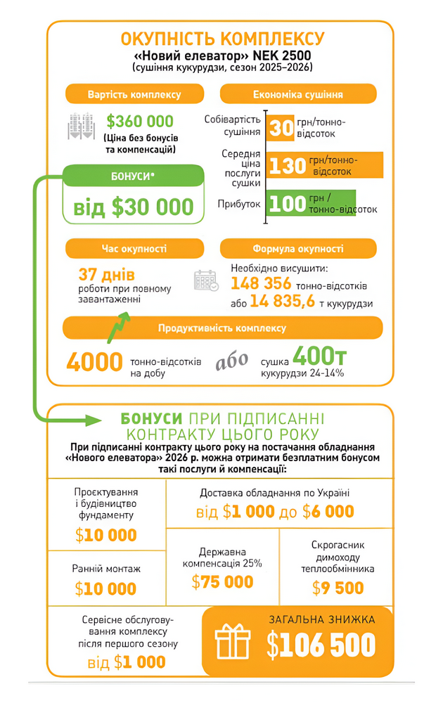 Після минулого сухого року попит на сушильне обладнання стабілізувався. Це створило високу конкуренцію на ринку, а в аграріїв з’явилася можливість закупити обладнання з відчутними дисконтом та сервісним пакетом. Наприклад, «Новий Елеватор» озвучує економію на проєктуванні, монтажі та сервісі, яка в сумі може перевищувати $30 000 на невеликому об’єкті. Вигідними бонусами є й навчання команди, гарантійний/післягарантійний супровід, оптимізація вже наявних ліній та консультації з організації процесів.