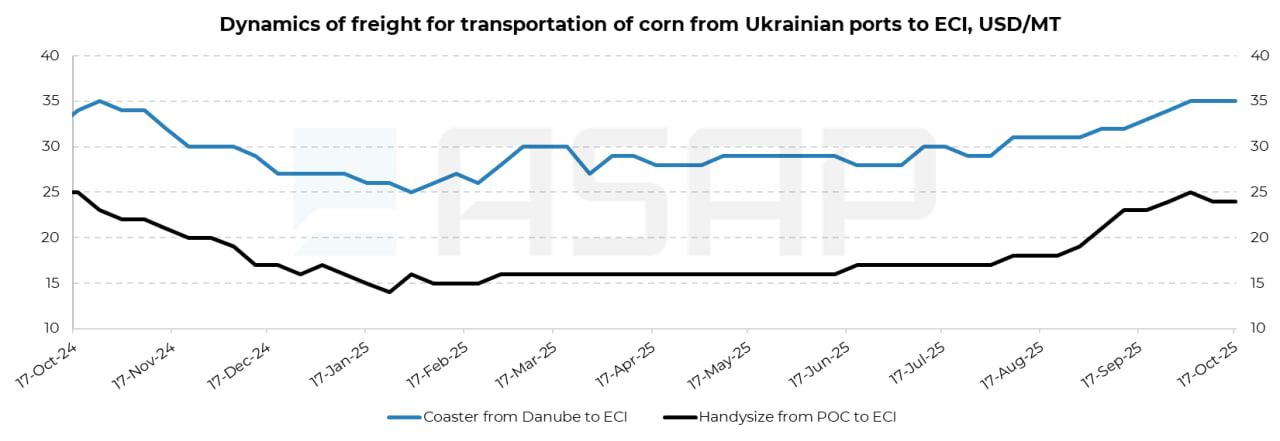У сегменті костерів ставки для перевезення 6 тис. т кукурудзи з українських дунайських портів до Східного узбережжя Італії утримуються на рівні 35–37 $/т.