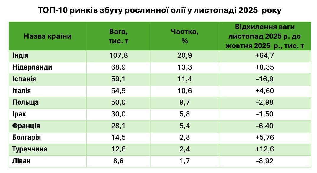 Найбільший попит на українську олію спостерігався з боку Індії, Нідерландів, Іспанії, Італії та Польщі.