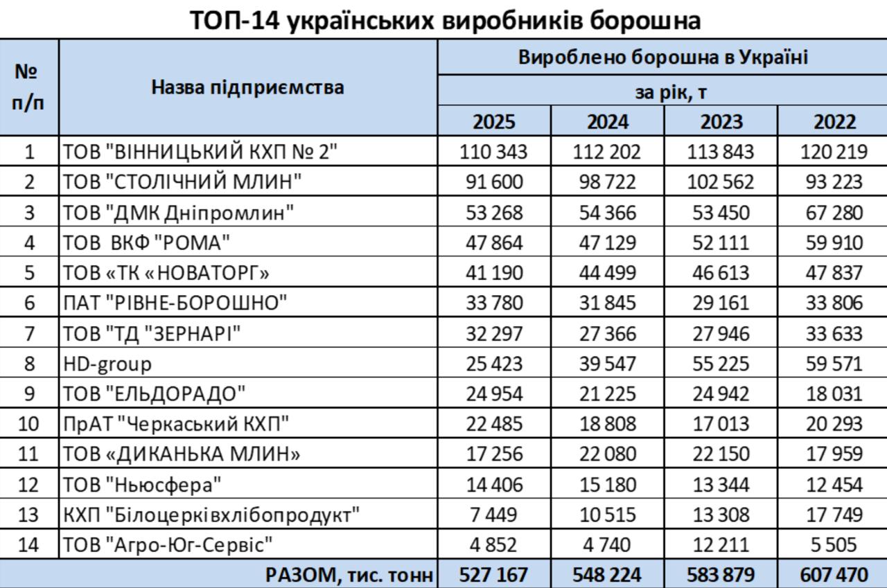 У 2025 році чотирнадцять найбільших підприємств — членів Спілки «Борошномели України» — виробили 527,2 тис. т борошна. Це на 4% менше, ніж торік, і становить 33% від оціночного обсягу виробництва борошна в країні загалом, повідомляє ІА «АПК-Інформ».