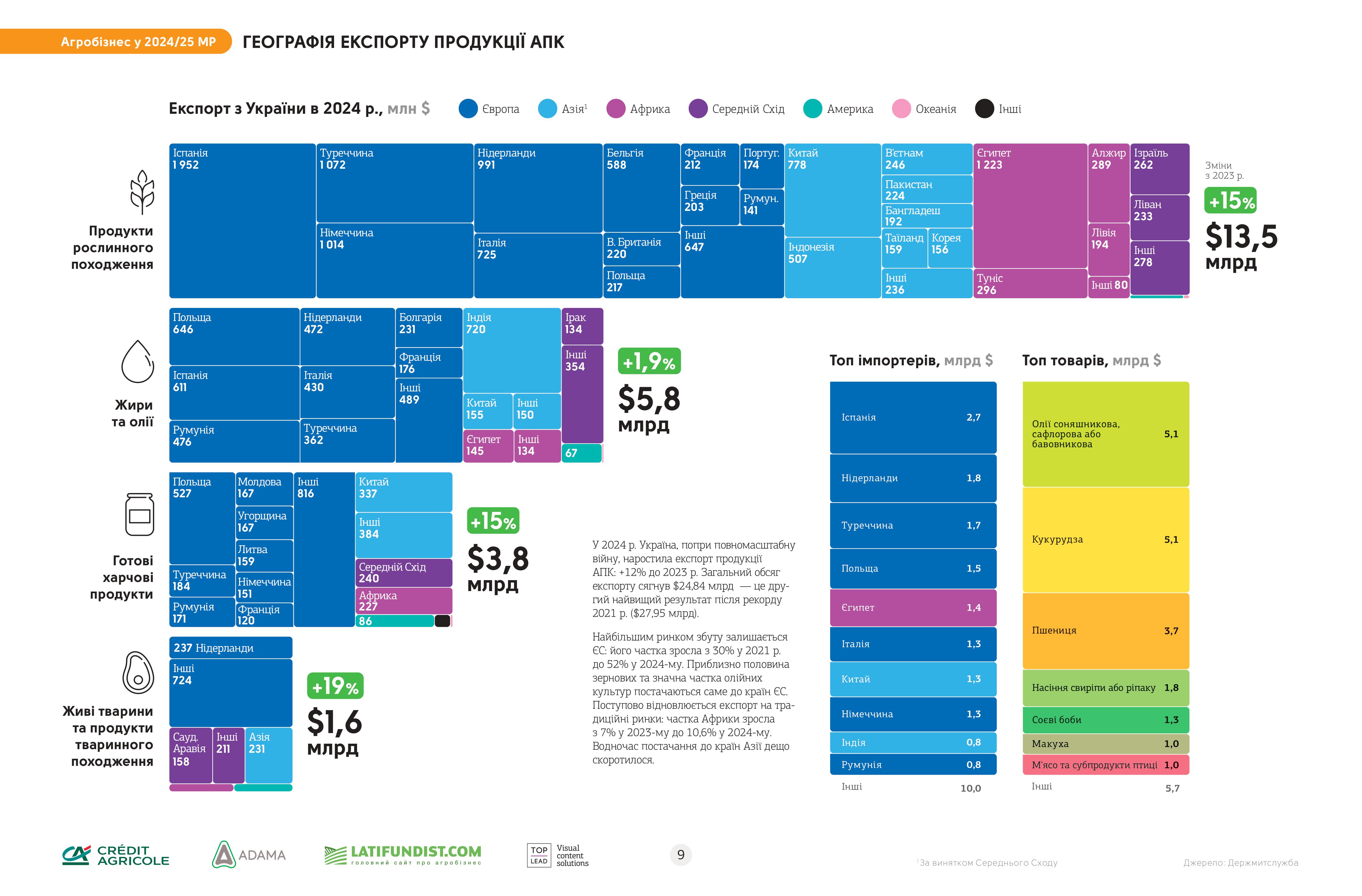 Рейтинг очолила Туреччина, яка три роки поспіль посідала третє місце у топ-10. У 2025 році експорт до цієї країни зріс на 33% — до $2 211 млн (проти $1 658 млн у 2024-му). Її частка у вітчизняному агропродовольчому експорті становила 9,7%.