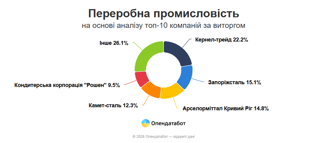 До десятки найбільших компаній переробної промисловості України за підсумками 2025 року увійшли три представники агросектору. Про це свідчать дані індексу Опендатабота.