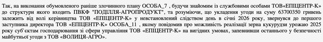 Слідчі вважають, що ексміністр, користуючись довірою на аграрному ринку, переконав першого заступника директора «Епіцентр-К» у надійності угоди. Після цього компанія долучилася до процесу закупівлі кукурудзи.