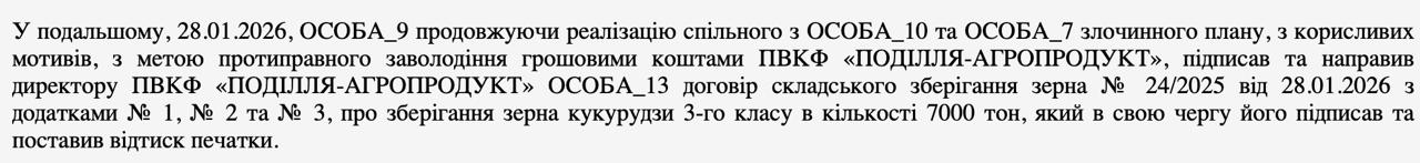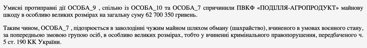 За версією слідства, компанію ПВКФ «Поділля-Агропродукт» ввели в оману щодо наявності 7 тис. т кукурудзи на елеваторі «Волиця-Агро», через що вона зазнала збитків на 62,7 млн грн