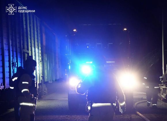 Під час повітряної тривоги було зафіксовано влучання та падіння БПЛА. Один із дронів влучив у трюм вантажного судна — там спалахнула пожежа.